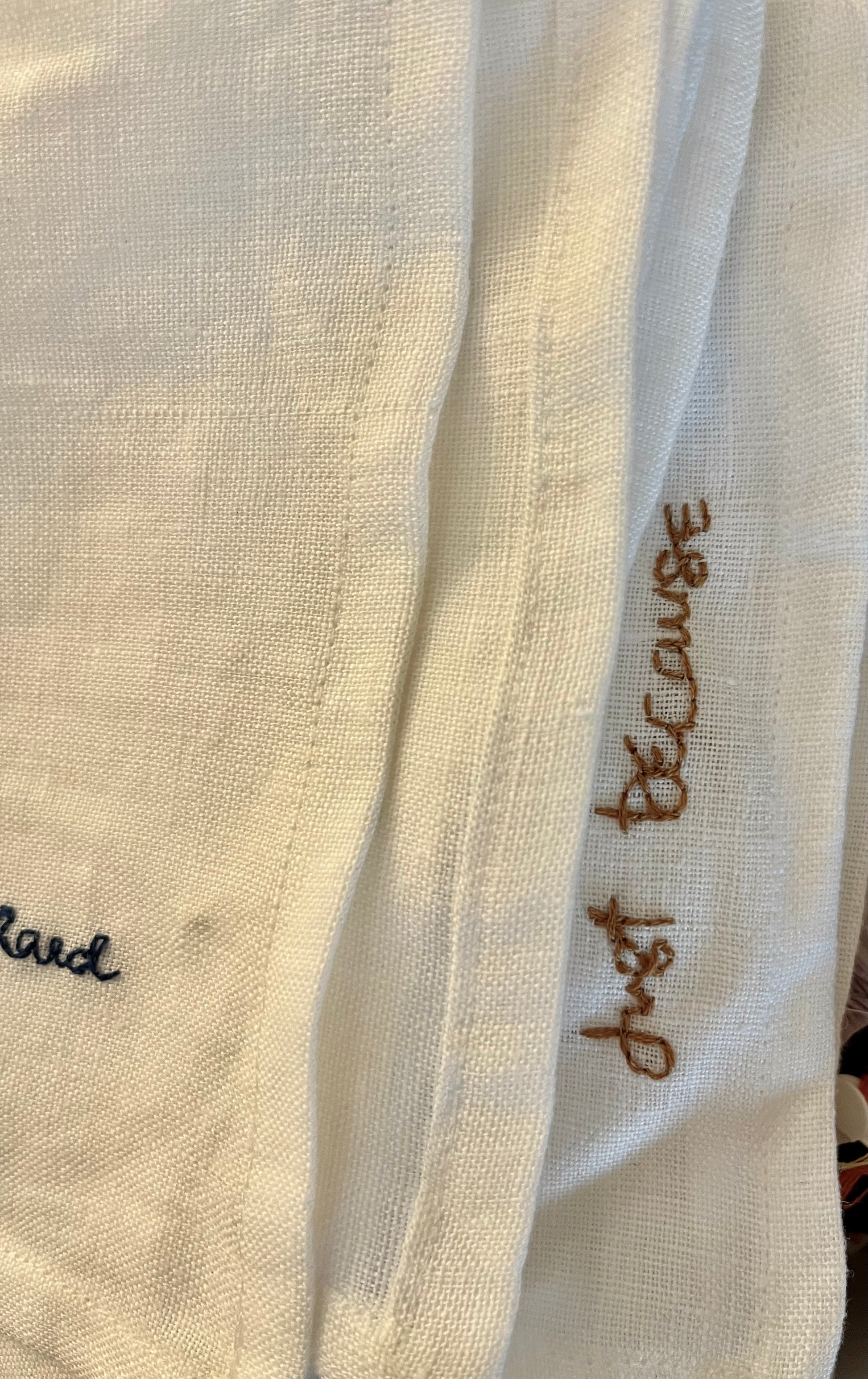 Hand embroidered with a name, nickname, saying, date, even a treasured family recipe- these napkins are a special way of keeping memories alive.
